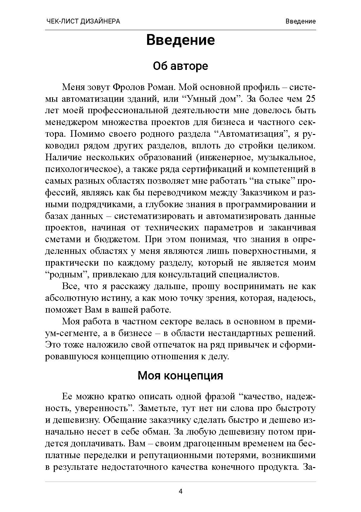 Концепция автора: «Качество, надежность, уверенность». Автор убежден, что погоня за скоростью и дешевизной изначально обречена на провал и ведет к потерям репутации, времени и средств. Настоящая экономия достигается за счет продуманности, работы с профессионалами и использования чужого опыта.