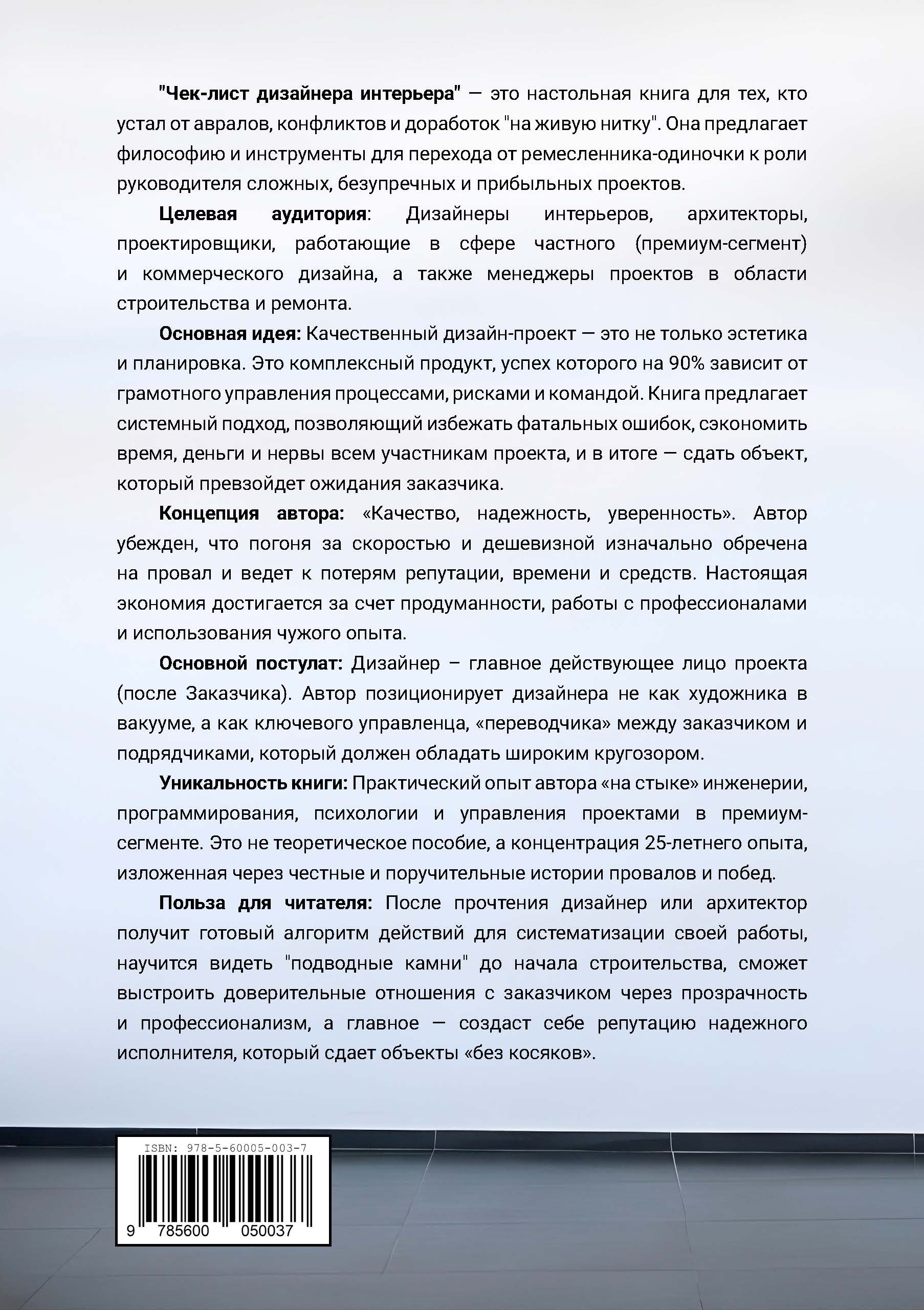«Чек-лист дизайнера интерьера» — это настольная книга для тех, кто устал от авралов, конфликтов и доработок «на живую нитку». Она предлагает философию и инструменты для перехода от ремесленника-одиночки к роли руководителя сложных, безупречных и прибыльных проектов.